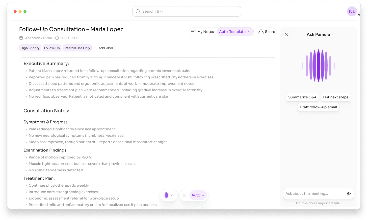 AI-powered medical notes, summaries, and insights. Pamela works silently in the background, so you can focus on your patients, not paperwork.