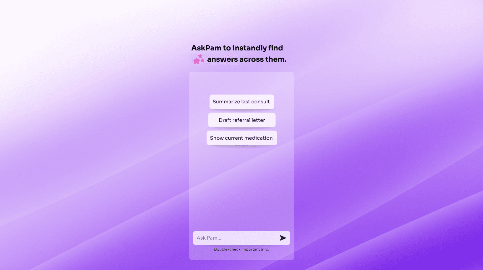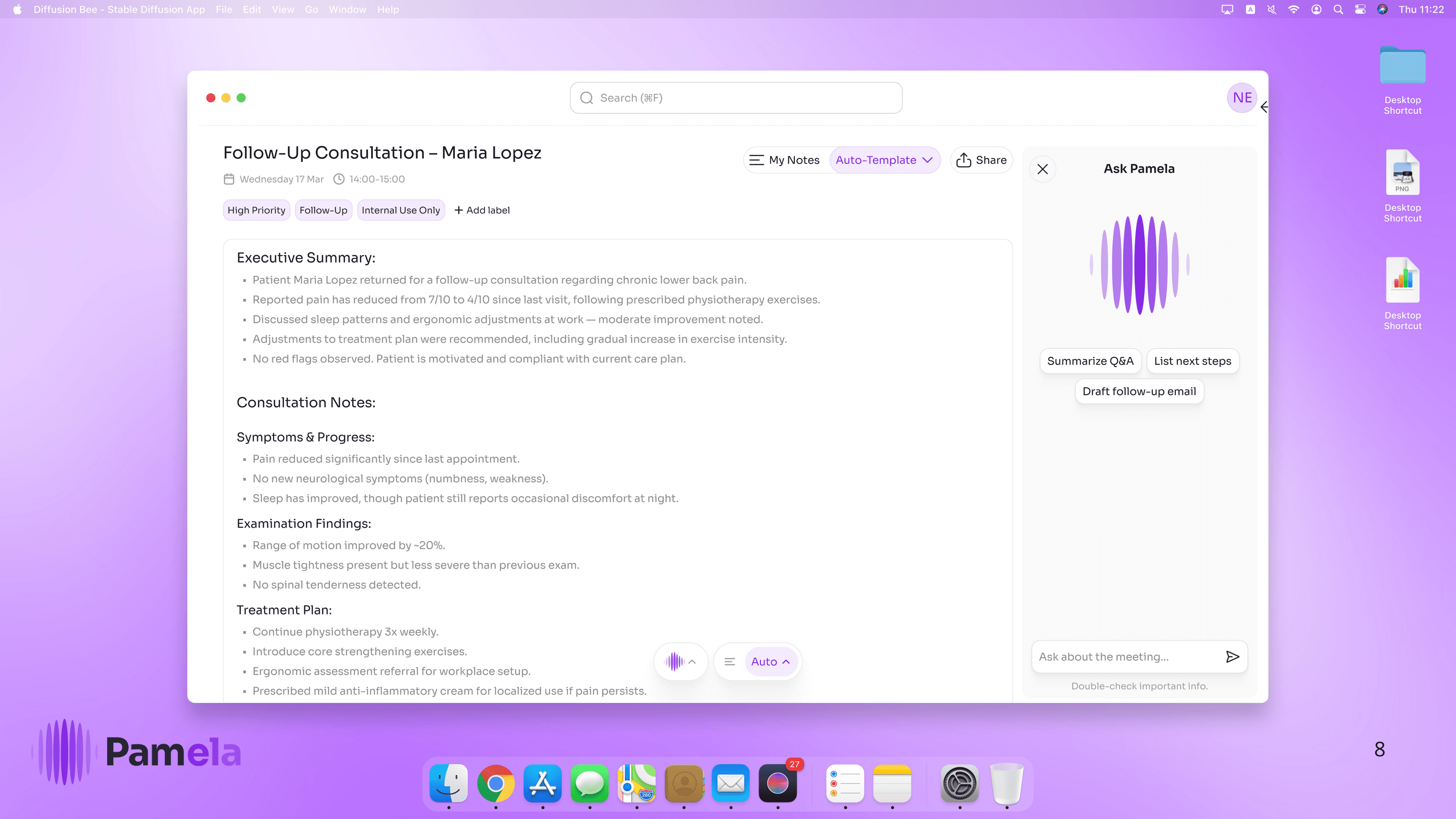 AI-powered medical notes, summaries, and insights. Pamela works silently in the background, so you can focus on your patients, not paperwork.